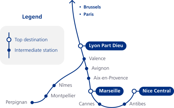 After a change of trains in Brussel-South/Midi or Paris, you can travel with TGV to Marseille. For a complete travel itinerary, consult our itinerary planner.
