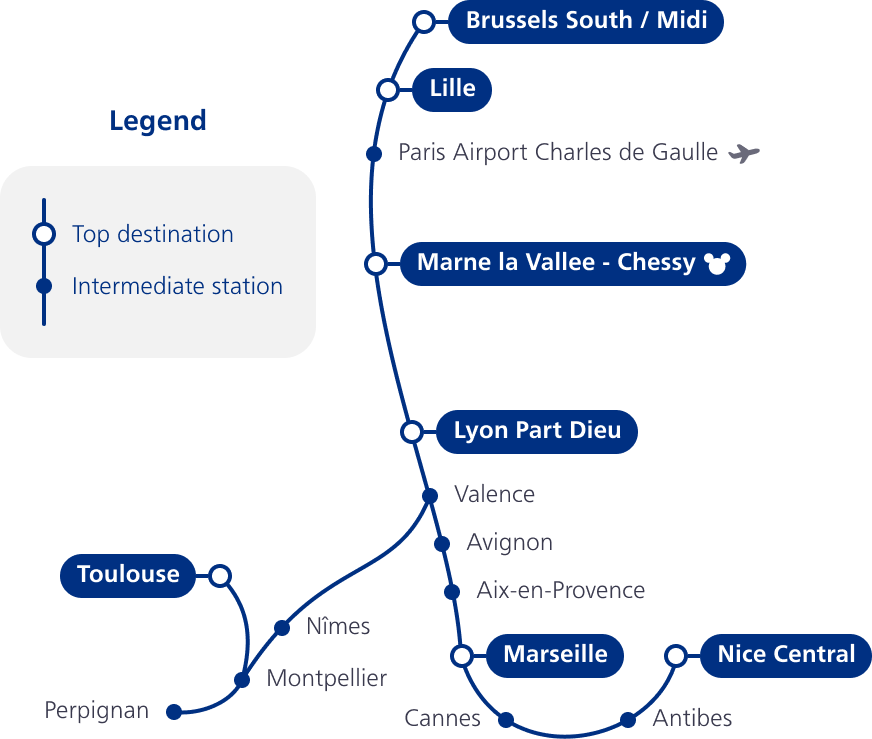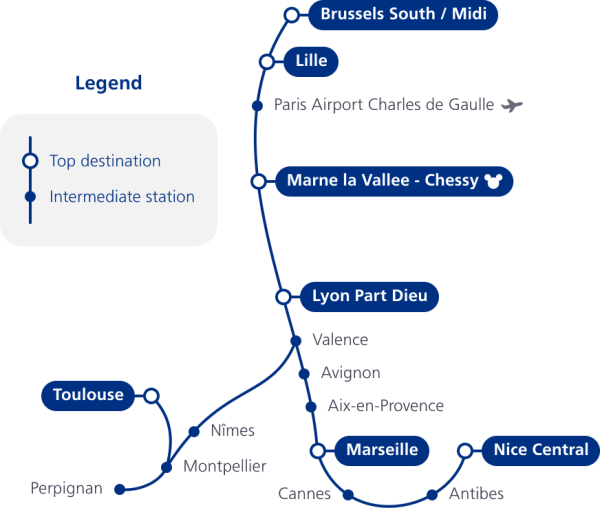 With the train you'll be in Montpellier in no time. You can travel with Eurostar to Paris or with Eurocity Direct to Brussels. There you change over to TGV. During your trip, you’ll have all you need to able to relax in our comfortable seats.