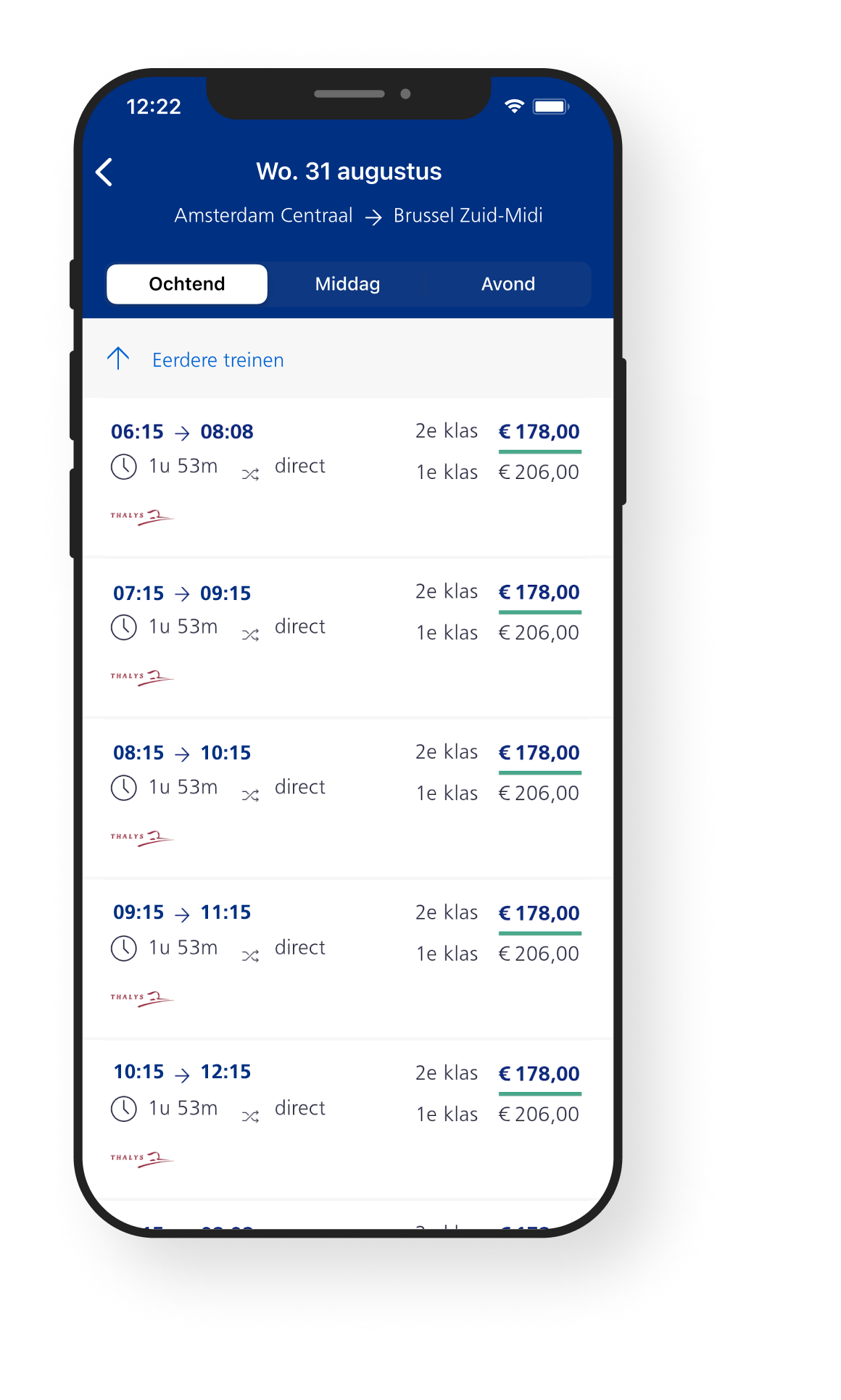 With the NS International app, you always have the international route planner at hand. So you can easily plan your international train journey. You will immediately see the price of your trip and can book it directly from the app and download it as an e-ticket or mobile ticket.