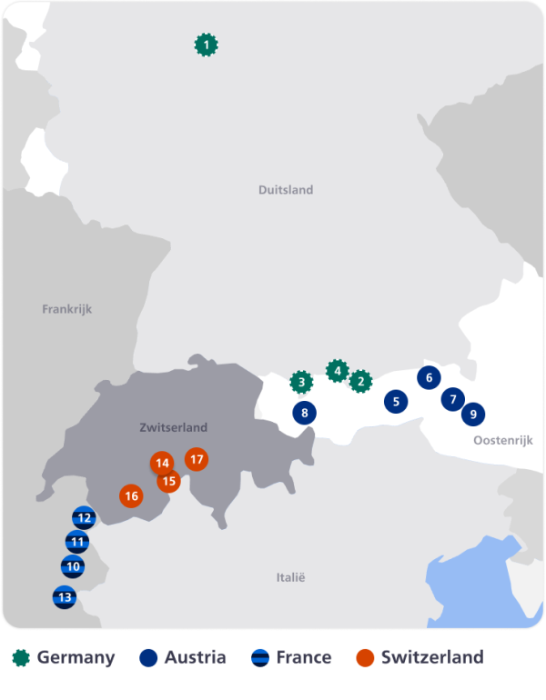 Below, you'll find an overview of ski resorts that are easy to reach by train in Germany, Austria, France and Switzerland. For each destination, you'll see how to get there, which train operators to use, how many transfers are needed, and the total travel time from Amsterdam Central.