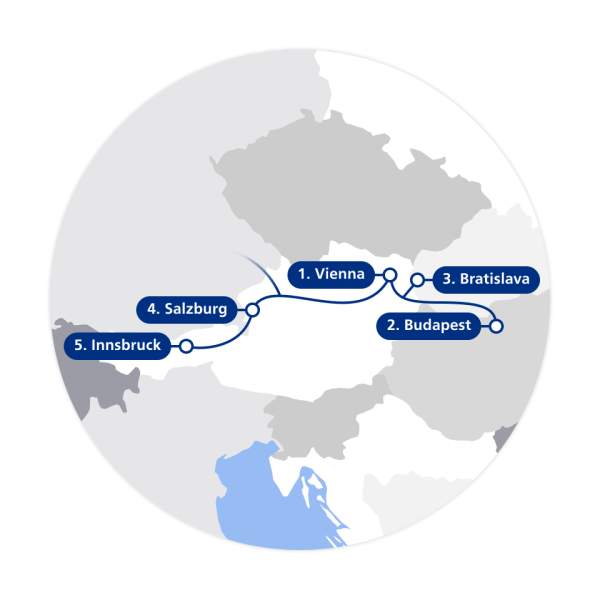 Depart from a station near you and discover the adventurous train journey along the charming central European cities of Vienna, Budapest, Bratislava, Salzburg and Innsbruck. We recommend the best hotspots for each city on the route!