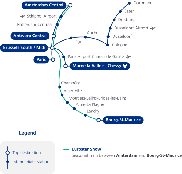 Eurostar is the high-speed train offering daily connections between the Netherlands, Belgium, and France. For winter sports, Eurostar Snow takes you to numerous destinations in the French Alps. Eurostar Sun will not operate in 2025. Travel to the south of France is possible with a transfer in Paris or Brussels.