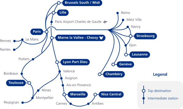 For cities in the southeast of France, like Marseille and Montpellier, you can travel to Brussels South/Midi with Eurostar or with Eurocity Direct. In Brussels you can catch a connecting TGV train so that you don’t have to pass through, but around, Paris. To travel with TGV to other destinations in France, like Bordeaux, Toulouse and Straatsburg, you’ll first need to travel to Paris Nord with Eurostar. Read more about changing trains in Paris Nord and Brussels-South/Midi