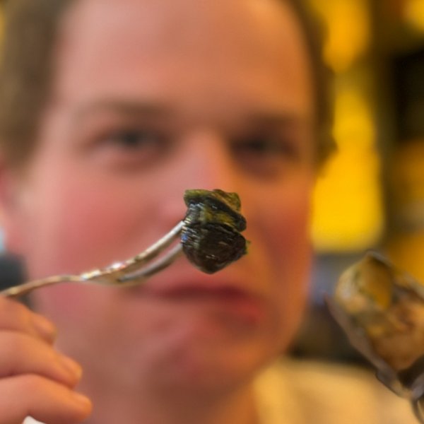 Ik ben daarna naar een restaurant gegaan waar ze zes slakjes serveerden die we met z'n drieën deelden. Met zo'n mooi tangetje en een vorkje peuter je dat los. Op een slak bijt je lekkerder dan op een oester. De structuur lijkt een beetje op kip. Maar na die twee slakken dacht ik: ik heb het geprobeerd, twee is voldoende.'