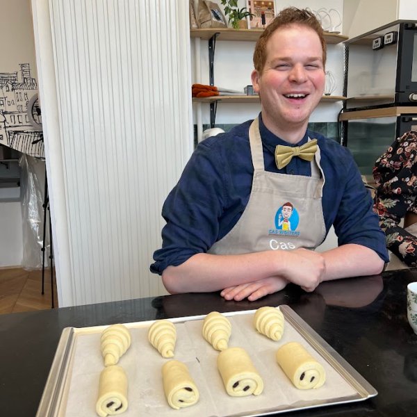 Cas geeft workshops vlaaien en koekjes bakken. Naast het bakken staat hij ook voor de klas.