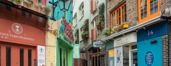 In de zeven straatjes van Seven Dials in Covent Garden kunt u urenlang dwalen langs boetieks, restaurants en cafés. Loop vooral ook Neal’s Yard niet voorbij. Dit kleurrijke steegje tussen Shorts Gardens en Monmouth Street is een lust voor het oog. Bij koffiebar Jacob the Angel zit u goed op het kleine terras.