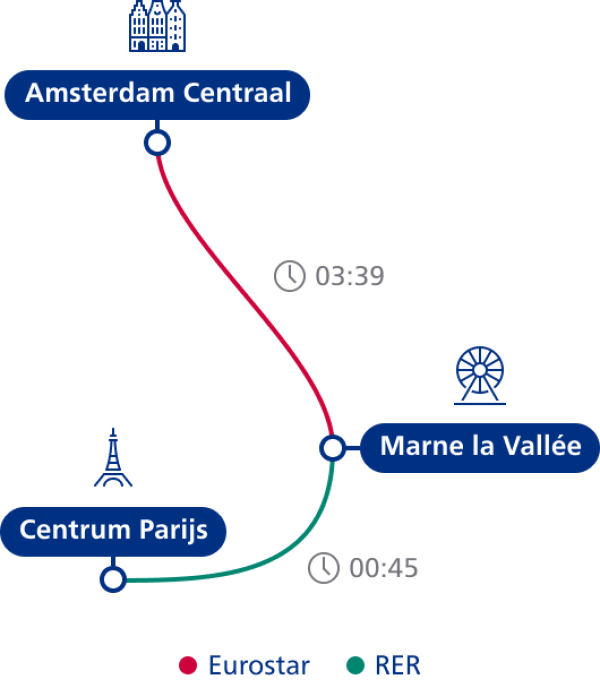 Eurostar rijdt 10x per dag vanaf Amsterdam Centraal naar Parijs Gare du Nord. Rechtstreeks, comfortabel en snel naar hartje stad. Eurostar rijdt óók van vrijdag tot en met maandag rechtstreeks naar Marne-la-Vallée Chessy, een station vlakbij Parijs. Wilt u naar Disneyland Paris? Boek dan de rechtstreekse Eurostar naar Marne la Vallée. Wilt u naar Parijs? Dan is het soms ook handig te boeken via station Marne la Vallée.