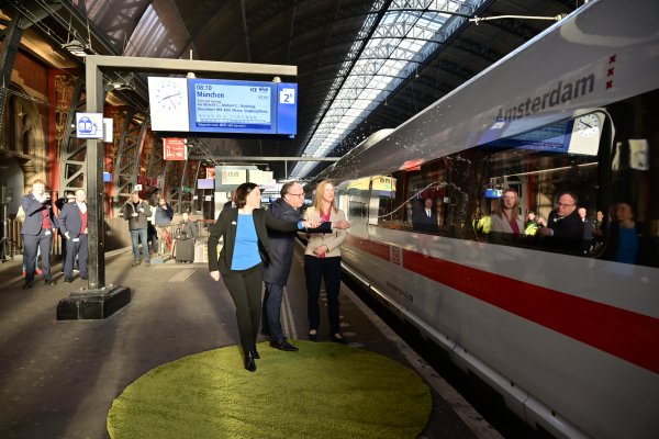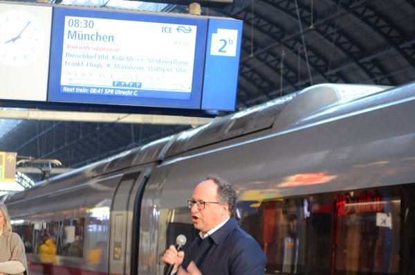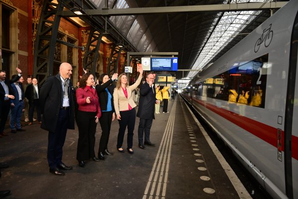 Vanochtend is de trein op Amsterdam Centraal gedoopt door Melanie van der Horst, wethouder Verkeer, Vervoer, en Luchtkwaliteit van de Gemeente Amsterdam: ‘Ik wens u, ICE-trein Amsterdam, uw bemensing en uw reizigers vele duurzame kilometers in Europa toe'.