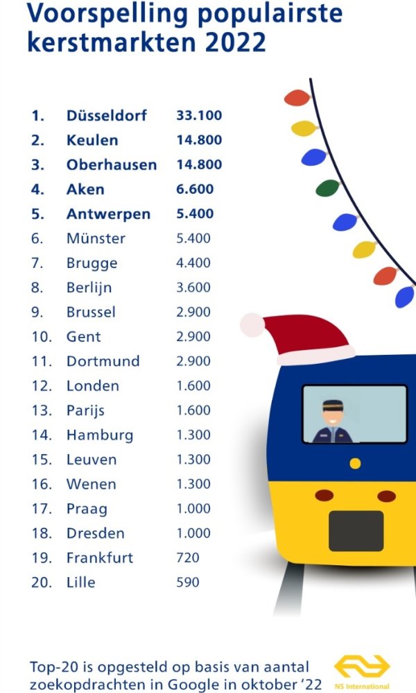 Kerstmarkten bezoeken is niet alleen in Duitsland razend populair, maar ook bij onze zuiderburen zijn veel Nederlanders te vinden. Binnen de top-20 zijn er maar liefst 5 Belgische steden te vinden die makkelijk te bezoeken zijn met de trein. Antwerpen wordt de meest populaire Belgische kerstmarkt bij Nederlanders. De bruisende stad staat op de vijfde plek in de top-20. Daarop volgen Brugge (nr. 7), ook wel ‘Venetië van het Noorden’, en hoofdstad Brussel (nr. 9). Ook studentenstad Gent en Leuven hebben een mooie positie in de top-20.