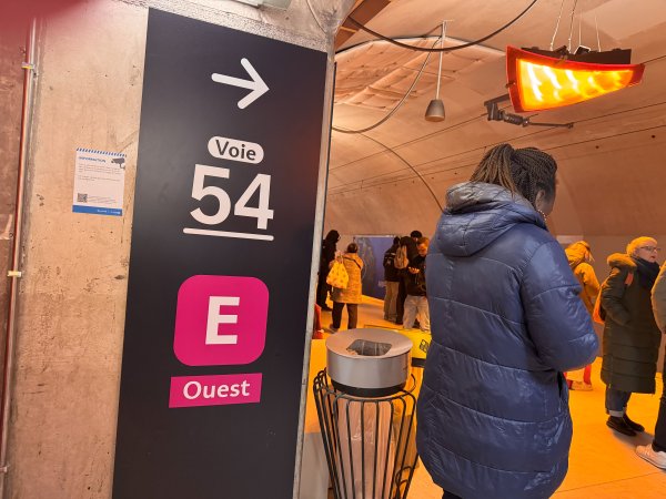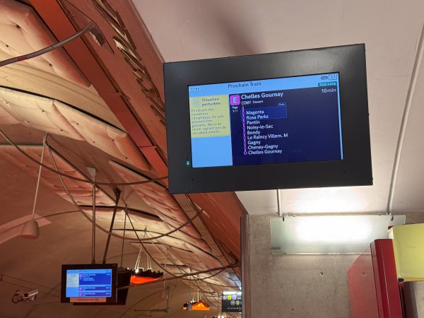 - Vanaf de trein richting de RER: Loop na aankomst van de trein het perron af naar de stationshal. Volg de borden waarop RER E (rose) staat en neem de roltrappen naar beneden.
