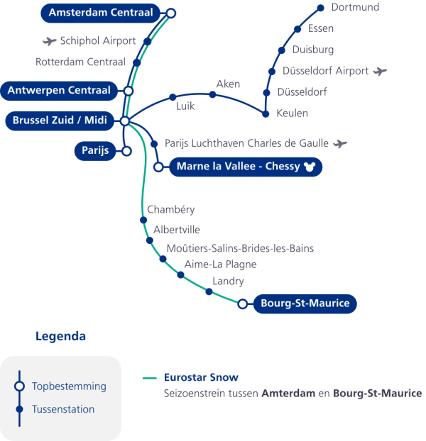 Eurostar Snow brengt u in de wintermaanden rechtstreeks naar Chambéry, Albertville, Moûtiers, Aime-la-Plagne, Landry en Bourg-St-Maurice. Vanaf deze stations vertrekken bustransfers naar vele skidorpen. Bekijk het overzicht van wintersportbestemmingen of lees meer over Eurostar naar de Alpen.