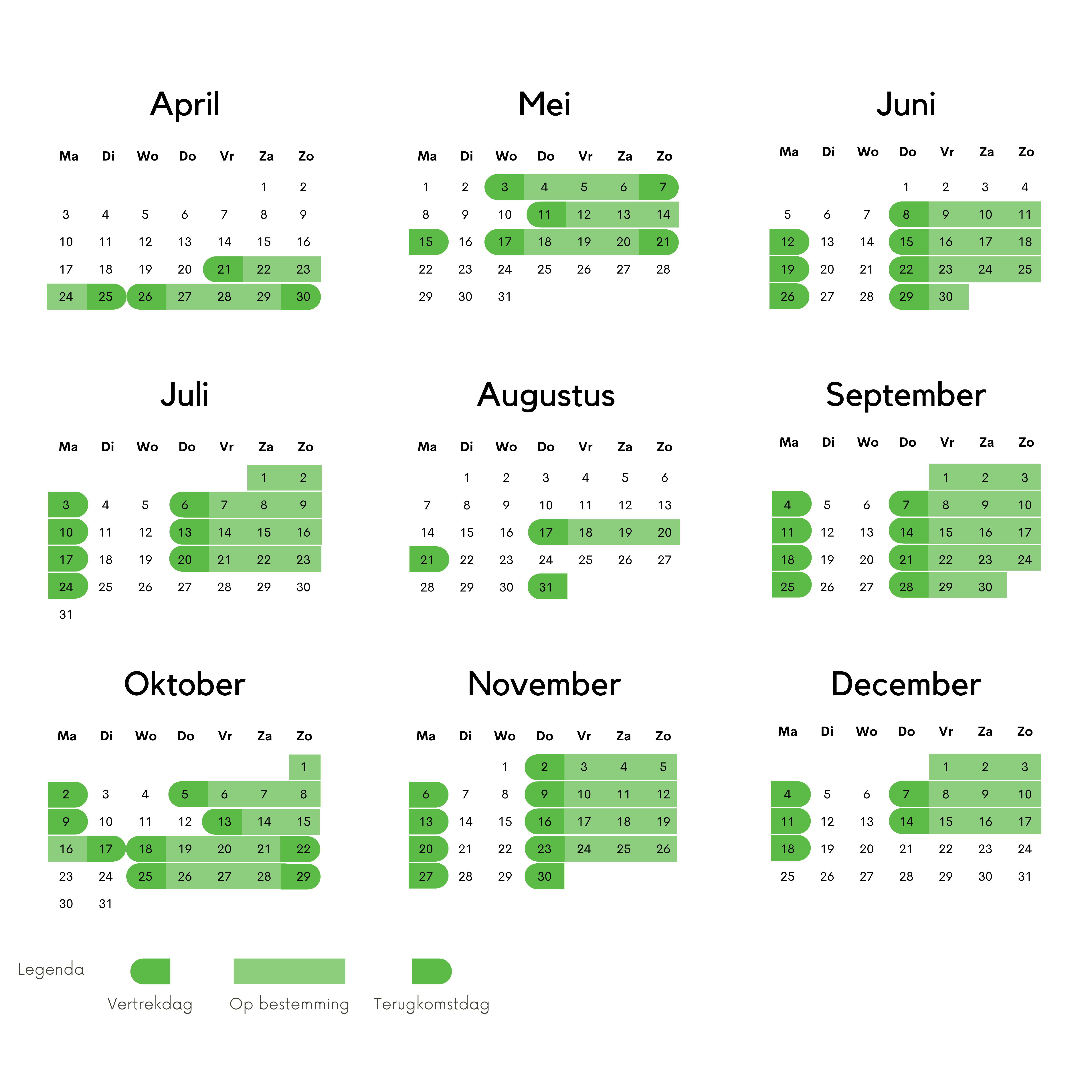 • Exact aantal kan per dienst verschillen; vooraf reserveren is daarom verplicht