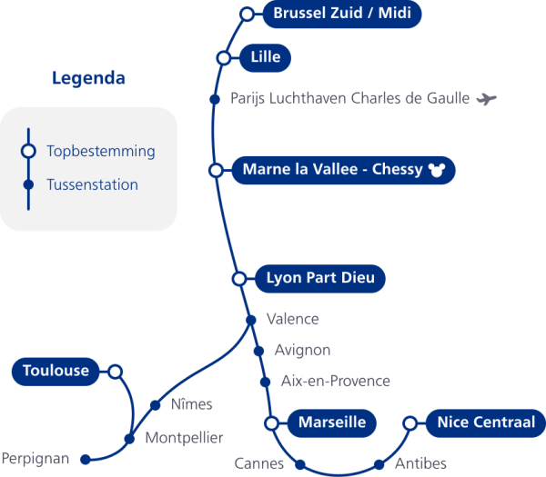 Reist u richting Lille, Marne-la-Vallée-Chessy (Disneyland), Perpignan of Nice, dan is de overstap wel heel erg eenvoudig.