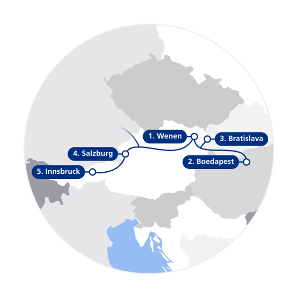 Reizen met de trein heeft vele voordelen: u reist snel, gemakkelijk, geniet onderweg van prachtige uitzichten en komt uitgerust aan in het hart van de stad. Daarnaast draagt u bij aan een beter milieu door een flinke CO2-besparing. Vertrek vanuit een station bij u in de buurt en ontdek de avontuurlijke treinreis langs de gezellige Centraal-Europese steden Wenen, Boedapest, Bratislava, Salzburg en Innsbruck. Wij tippen de leukste hotspots voor elke stad op de route!