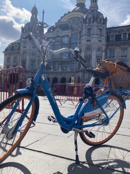 De keus viel op Antwerpen. Na aankomst op het mooie station begint de zoektocht. Waar staan de fietsen? In de app staat een handig kaartje, 47 fietsen zijn aanwezig. Ergens. Voor het station staan de Velo fietsen. Waar staan de blauwe fietsen? Het antwoord is: beneden. Vlak voor het station in Antwerpen gaat een trap naar beneden naar een fietsenstalling waar ook een groot aantal blauwe fietsen staat.