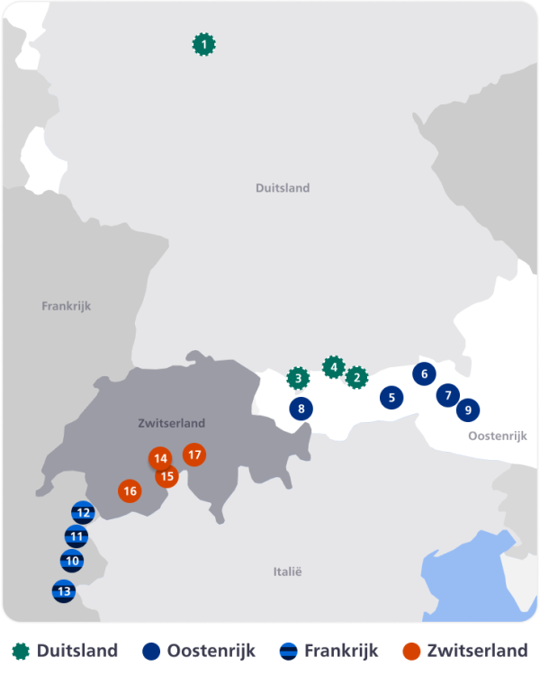 Hieronder vindt u een overzicht van goed bereikbare skigebieden in Duitsland, Oostenrijk, Frankrijk en Zwitserland. Bij elk gebied ziet u hoe u er komt, welke vervoerders u gebruikt, hoe vaak u moet overstappen en hoe lang de reis duurt vanaf Amsterdam Centraal.